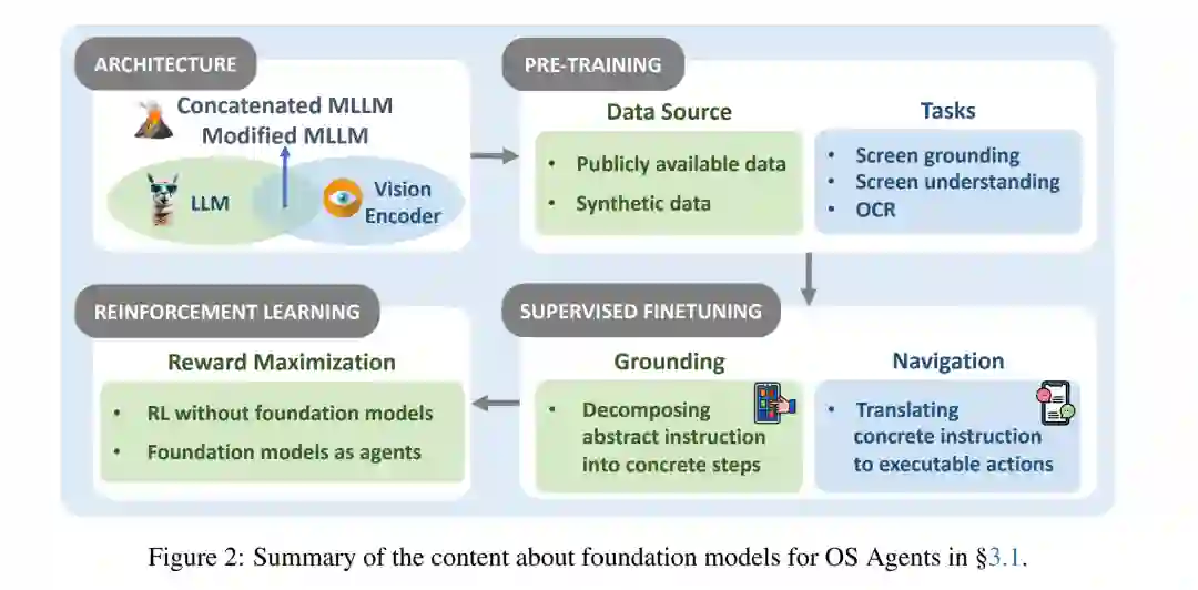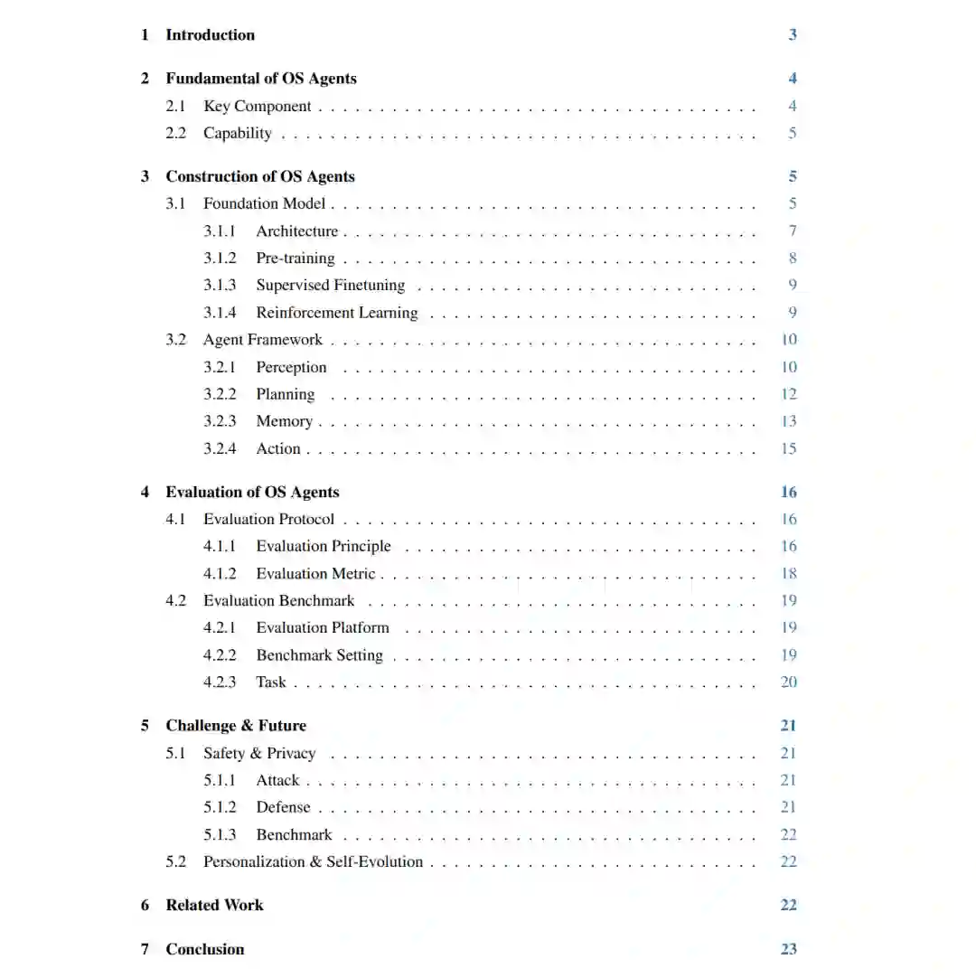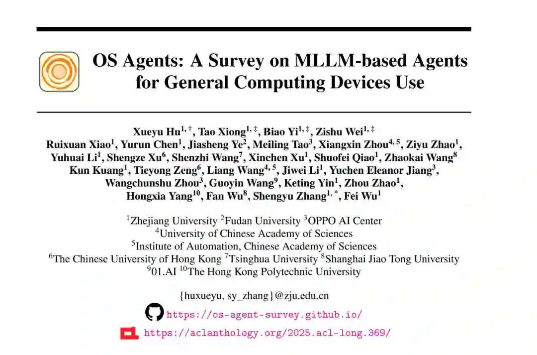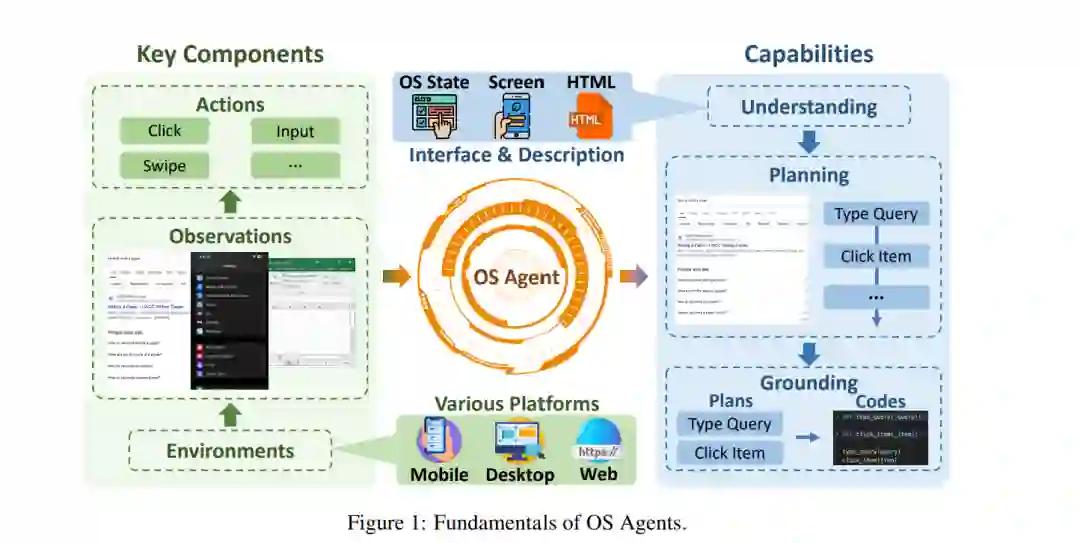 构建一个类似于漫威电影《钢铁侠》中 J.A.R.V.I.S. 的超级智能 AI 助理——能够协助托尼·斯塔克控制各种系统并自动化任务——一直是人类的长期愿景。这类实体被称为操作系统智能体(Operating System Agents,简称 OS Agents),因为它们在操作系统(OS)提供的环境和界面(如图形用户界面 GUI)中运行,从而利用计算设备(例如计算机和移动电话)完成各种任务。OS 智能体能够自主完成任务,具有显著提升全球数十亿用户生活质量的潜力。想象这样一个世界:在线购物、旅行安排预订等日常事务都能由这些智能体无缝处理,从而大幅提升效率与生产力。 过去,Siri【Inc., 2024】、Cortana【Research, 2024】、Amazon Alexa【Google, 2024】和 Google Assistant【Amazon, 2024】等虚拟助手已初步展示了这种潜力,但由于模型能力(如上下文理解【Tulshan and Dhage, 2019】)的限制,这些产品未能实现广泛应用和全面功能。 幸运的是,近年来多模态大语言模型((M)LLMs)如 Gemini【Google】、GPT【OpenAI】、Grok【xAI】、Yi【01.AI】和 Claude【Anthropic】系列的进展,开启了 OS 智能体发展的新纪元。这些模型展现出卓越的能力,使得 OS 智能体能够更好地理解复杂任务并执行计算设备操作。一些代表性案例包括 Anthropic 推出的 Computer Use【Anthropic, 2024a】、苹果的 Apple Intelligence【Apple, 2024】、智谱 AI 的 AutoGLM【Liu et al., 2024a】和 Google DeepMind 的 Project Mariner【DeepMind, 2024】。 例如,Computer Use 利用 Claude【Anthropic, 2024b】直接与用户的计算机交互,旨在实现无缝任务自动化。同时,研究界也提出了多种构建基于 (M)LLM 的 OS 智能体的方案【Gur et al., 2023; You et al., 2025; Gou et al., 2024; Meng et al., 2024; Chen et al., 2024a; Wu et al., 2024a; Zhang et al., 2023a; Yan et al., 2023; Ma et al., 2023; Zhang et al., 2024a; He et al., 2024a; Wang and Liu, 2024】。例如,Wu 等人【2024a】提出的 OS-Atlas 是一个基础 GUI 动作模型,它通过跨平台合成 GUI 对齐数据,显著提升了 GUI 基础对齐能力与分布外任务表现;OS-Copilot【Wu et al., 2024b】则是一个智能体框架,旨在开发通用型智能体以自动化各种计算机任务,在多种应用场景中展现出强大的泛化能力和自我提升能力,即便在弱监督下亦表现出色。 鉴于该领域的迅速发展和日益丰富的研究成果,有必要进行一次全面综述,以整合当前研究现状。 在本综述中,我们首先在第 §2 节讨论 OS 智能体的基本概念,定义何谓 OS 智能体,并如图 2 所示,重点介绍三个核心组成部分:环境、观测空间与动作空间(§2.1)。随后,我们总结 OS 智能体应具备的关键能力,包括理解、规划与基础对齐(§2.2)。 接下来,在第 §3 节中我们深入探讨构建 OS 智能体的两个关键方面:(1)面向特定领域的基础模型开发,涵盖架构设计、预训练、监督微调与强化学习等内容(§3.1);(2)围绕这些模型构建高效的智能体框架,涵盖感知、规划、记忆与动作等核心模块(§3.2)。 在第 §4 节中,我们回顾了 OS 智能体常用的评估协议(§4.1)与基准数据集(§4.2),以了解其在多样任务中的性能表现。最后在第 §5 节,我们探讨 OS 智能体当前所面临的挑战与未来研究方向,特别关注安全与隐私问题(§5.1)、个性化与自我演化能力(§5.2)。 本综述旨在推动 OS 智能体的研究与开发,通过深入剖析其关键能力、构建方法与评估方式,帮助读者全面理解该领域的最新趋势、技术挑战与未来发展。我们也认识到,OS 智能体仍处于早期阶段,新的方法与应用正在迅速涌现。为支持该领域的持续进展,我们维护了一个开源的 GitHub 仓库,作为动态资源。我们希望本研究能够激发更多创新,推动 OS 智能体在学术研究与工业应用中的发展。 https://arxiv.org/abs/2508.04482