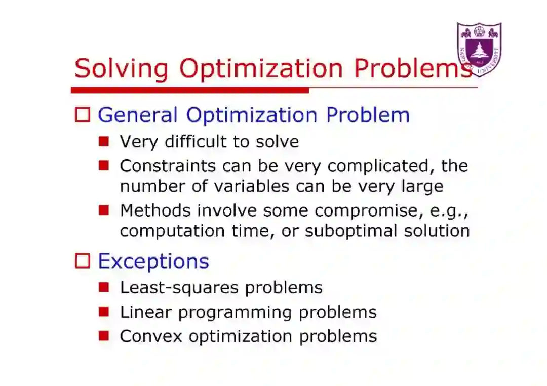 Lecture 1 Introduction Lecture 2 Mathematical Background Lecture 3 Convex Sets Lecture 4 Convex Functions I Lecture 5 Convex Functions II Lecture 6 Convex Optimization Problems I Lecture 7 Convex Optimization Problems II Lecture 8 Duality I Lecture 9 Duality II Lecture 10 Applications Lecture 11 Unconstrained Minimization I Lecture 12 Unconstrained Minimization II