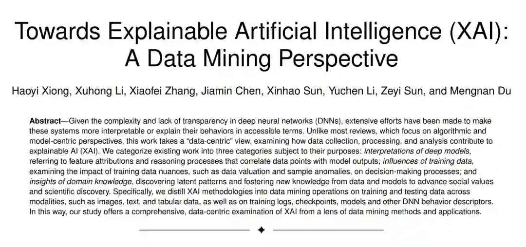 鉴于深度神经网络(DNNs)的复杂性和不透明性,人们已经做出了广泛努力,使这些系统更易于解释或用易于理解的术语解释它们的行为。与大多数专注于算法和以模型为中心的视角的综述不同,本工作采取了“以数据为中心”的视角,考察了数据收集、处理和分析如何促进可解释人工智能(XAI)。我们将现有工作分类为三个目的类别:深度模型的解释,涉及特征归因和将数据点与模型输出相关联的推理过程;训练数据的影响,检查训练数据细微差别(如数据价值和样本异常)对决策过程的影响;以及领域知识的洞察,从数据和模型中发现潜在模式,培养新知识,以推进社会价值和科学发现。具体来说,我们将XAI方法提炼为对训练和测试数据的数据挖掘操作,这些数据跨越不同的模态,如图像、文本和表格数据,以及对训练日志、检查点、模型和其他DNN行为描述符的操作。通过这种方式,我们的研究从数据挖掘方法和应用的角度,对XAI进行了全面的、以数据为中心的审视。