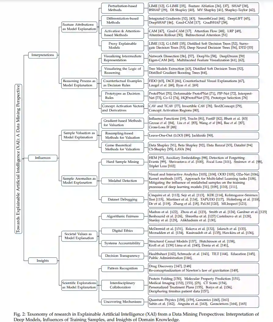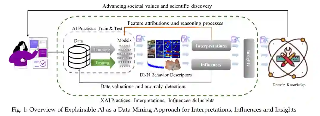 与上述工作相比,我们的调查(图2中显示的简要结果)通过从数据挖掘的角度探索XAI的三重角色来弥补XAI文献中的差距:(1)解释模型的行为以理解其决策;(2)估算数据的影响,以评估和识别关键样本;(3)从模型和数据中提炼洞察,以获得推动社会价值和科学发现的新理解。