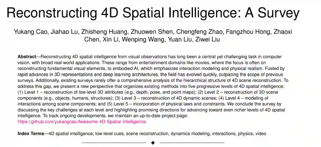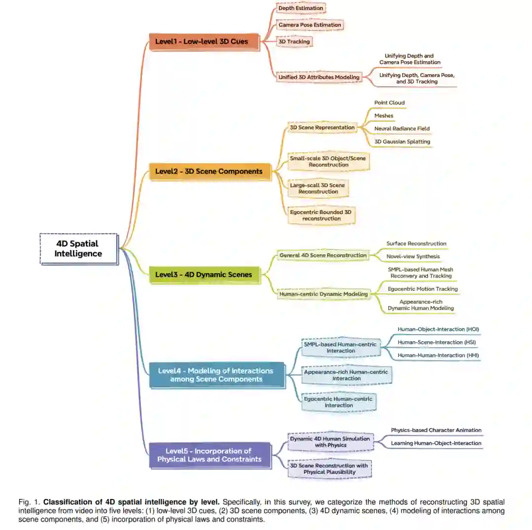 摘要——从视觉观测中重建四维空间智能长期以来一直是计算机视觉领域中的核心难题之一,并具有广泛的现实应用场景。这些应用涵盖从电影等娱乐领域(侧重于基础视觉要素的重建)到具身智能(强调交互建模与物理现实性)。得益于三维表示和深度学习架构的迅猛发展,该研究方向迅速演进,已远超以往综述的覆盖范围。此外,现有综述往往缺乏对四维场景重建中层次结构的系统分析。为填补这一空白,本文提出一种新的视角,将现有方法按照五个逐级递进的四维空间智能层级进行组织: (1) 第一层级:低层三维属性的重建(如深度、姿态和点云图); (2) 第二层级:三维场景组成要素的重建(如物体、人类、结构体); (3) 第三层级:四维动态场景的重建; (4) 第四层级:场景组件之间交互的建模; (5) 第五层级:物理规律与约束的融合建模。 本文最后讨论了各层级所面临的关键挑战,并指出了迈向更高层次四维空间智能的潜在研究方向。为了追踪该领域的最新进展,我们维护了一个实时更新的项目页面: https://github.com/yukangcao/Awesome-4D-Spatial-Intelligence。 关键词——四维空间智能、低层线索、场景重建、动态建模、交互建模、物理建模、视频