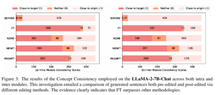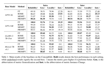 实验结果显示了不同编辑方法在大语言模型概念知识对齐任务中的表现,具体分析如下: