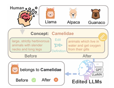 概念,例如“动物”或“工具”,用于总结和表达一类事物的共性特征和本质属性。人类通过对具体事物的观察和分析,将个体间的相似点提炼出来,形成更高层次的认知和理解。在众多评测基准中,大语言模型凭借其强大的自然语言处理能力,展现出了与人类智能相接近的表现。然而,这些模型是否能够真正像人类一样理解概念,并基于新的信息实现概念知识的更新,依然是一个充满挑战性的问题。此外,在研究概念本身变化的过程中,关联实例的变化同样是不可忽视的重要因素。当概念的定义发生调整时,作为其具体化表现的实例集合也会随之改变。例如,新定义可能会将一些实例排除出概念的范畴,或纳入此前未被涵盖的新实例。这种概念与实例之间的双向关联,反映了知识动态更新的过程。