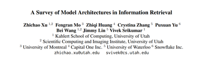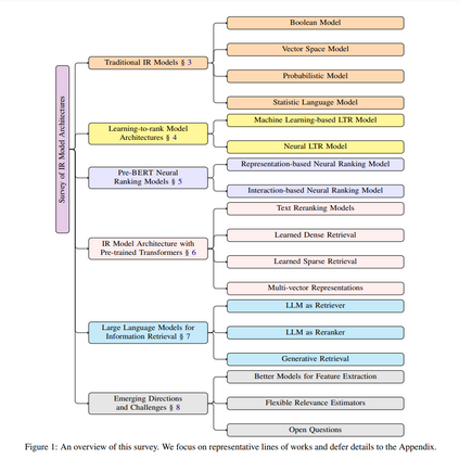 本综述研究了信息检索(IR)中模型架构的发展,重点关注两个关键方面:用于特征提取的骨干模型和用于相关性估计的端到端系统架构。本文有意将架构考虑与训练方法区分开,以便对IR系统中的结构性创新进行集中分析。我们追溯了从传统基于术语的方法到现代神经网络方法的发展,特别突出变换器(transformer)模型以及随后的大规模语言模型(LLM)所带来的影响。最后,我们讨论了新兴的挑战和未来的发展方向,包括性能和可扩展性的架构优化、多模态和多语言数据的处理,以及如何适应超越传统搜索范式的新应用领域。