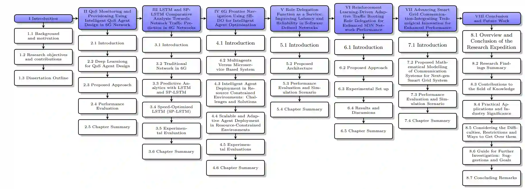 本文介绍了用于网络性能增强和管理的智能下一代自主系统,特别适用于 5G、B5G、6G 和 SDN 等网络。论文分为六个重要部分。首先,它重点关注在 6G 网络中使用智能 QoS 体设计进行 QoS 监控和供应。其次,阐述了 LSTM 和 SP-LSTM 对 6G 网络流量预测的比较分析。第三,利用 SE-DO 进行智能体优化,挖掘 6G 前沿导航。第四,论文将角色委托功能作为一种服务,以提高软件定义网络的可靠性和延迟。第五,进一步研究强化学习驱动的自适应流量路由角色授权,以提高 SDN 网络性能。最后,通过整合技术创新提高智能电网通信性能。总之,这项工作具有巨大潜力,可通过自动化、灵活性和人工智能彻底改变网络管理。