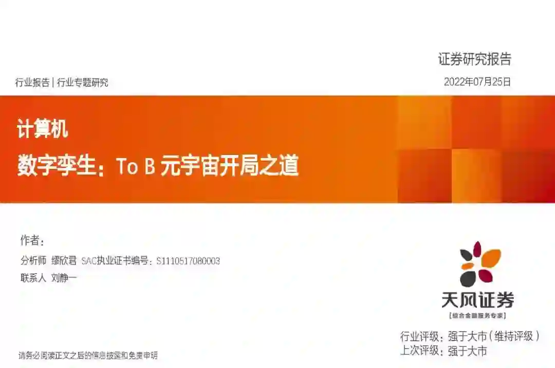 1、产业(ToB)元宇宙是数字经济的高阶信息表达:元宇宙受到关注的根本原因在于生产效率和经济发展需要新的形式来突破现有瓶颈,而元宇宙可以在空间维度上突破物理世界的限制,帮助迭代技术、提高决策和运营效率。