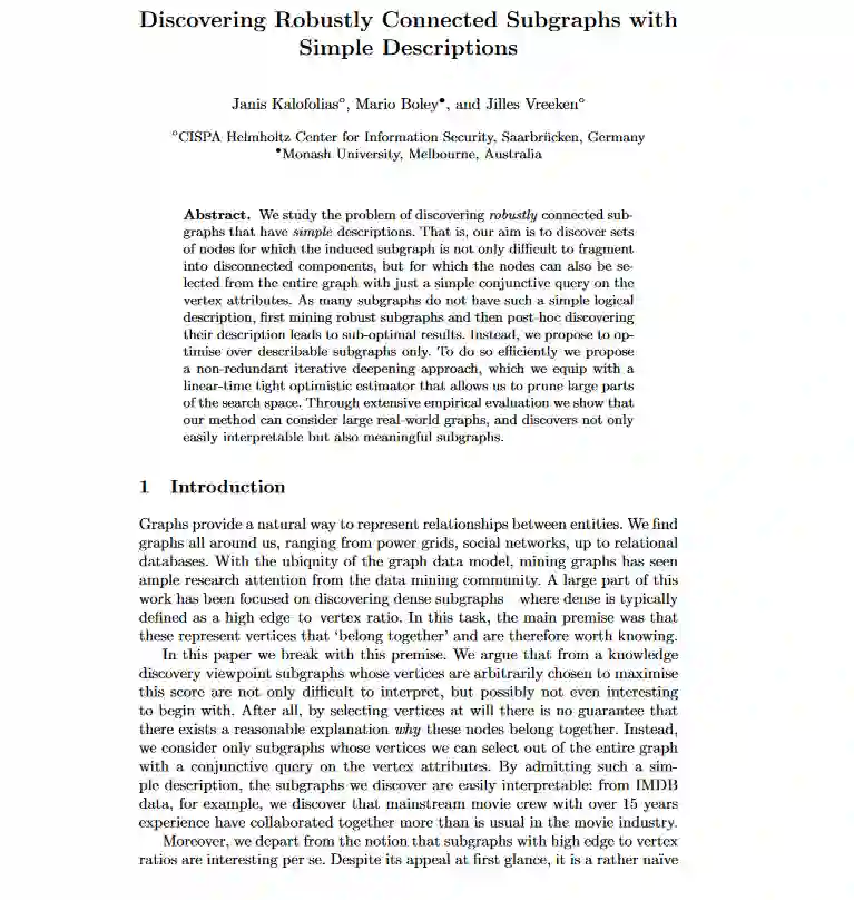 我们研究了发现具有不完全描述的鲁棒性连通子图的问题。也就是说,我们的目标是发现这样的节点集:对于这些节点集,诱导的子图不仅很难分割成不连接的组件,而且对于这些节点集,只需对顶点属性进行一个简单的连接查询,就可以将它们从整个图中分离出来。由于许多子图没有这样简单的逻辑描述,所以首先挖掘鲁棒性的子图,然后在事后发现它们的描述会导致次优结果。相反,我们建议只对可描述子图进行运算时间化。为了有效地做到这一点,我们提出了一个非冗余迭代深化方法,我们装备了乐观估计器,允许我们修剪搜索空间的大部分。通过大量的实证评价,我们证明我们的方法可以考虑大的真实世界图,并且发现不仅是可解释的而且是有意义的子图。