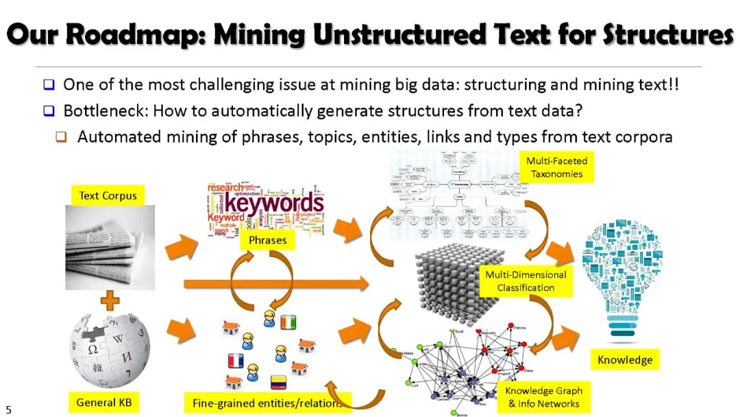 韩家炜教授认为,大量的文本数据本身就隐含了大量的隐模式、结构和知识,因此我们可以借助domain-independent 和 domain-dependent的知识库,来探索如何将海量数据从非结构化的数据转化为有用的知识。 (1)从文本数据中挖掘隐藏的结构。文本数据中隐藏着大量的结构,这步工作就是将这些数据挖掘出来。 (2)将文本数据转化为有类型的 Network/Text Cube。将文本数据变成有结构、有类型的数据(Network/Text Cube) (3)挖掘 Network/Text Cube 生成有用的知识。最后一步才是挖掘。