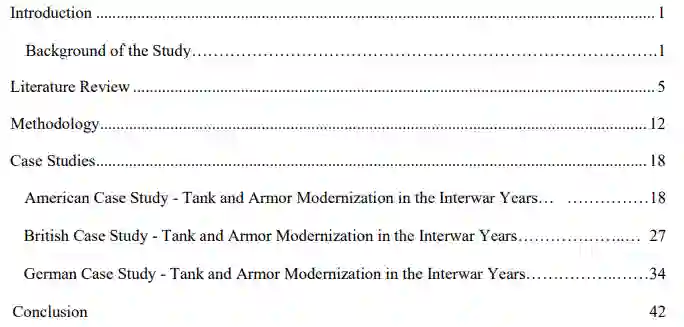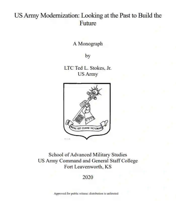 本研究报告由四个部分组成。导言部分介绍了研究的背景,提出了假设以及验证或否定假设的问题。文献综述 "通过讨论一些广为接受的组织变革理论来确定分析框架,并在 "方法 "部分概述了所选的案例研究。这一部分介绍了各个案例研究,明确了选择这些案例研究的理由,并构建了分析工具和评估标准。案例研究部分探讨了三个单独的军事现代化时期,并根据现代化条件标准衡量了每个时期的结果。在 "结论 "部分,加入了一个 "分析 "小节,对每个案例研究的结论进行总结和比较。该部分还包含一个 "建议 "小节,对从案例研究中得出的数据进行了叙述性分析,评估了一个或多个案例研究与陆军当前现代化工作之间任何可识别的直接相似之处,并就该主题的进一步研究途径提出了建议。