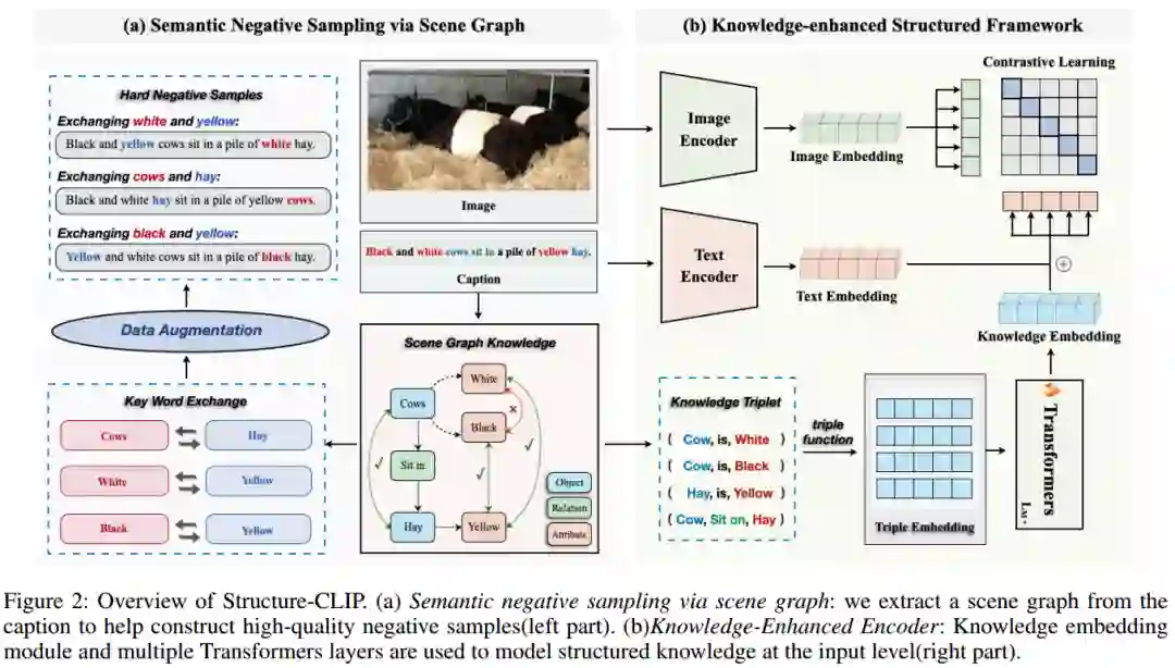 大规模视觉语言预训练在多模态理解和生成任务中取得了显著的效果。然而,现有的方法在需要结构化表示(即对象、属性和关系的表示)的图像-文本匹配任务上通常表现不佳。如图1 (a)所示,模型无法区分“宇航员骑马”和“马骑宇航员”。这是因为它们在学习多模态场景中的表示时未能充分利用结构化知识。在本文中,作者提出了一个端到端框架Structure-CLIP,它集成了场景图知识(Scene Graph Knowledge, SGK)来增强多模态结构化表示。首先,作者使用场景图来指导语义负样例的构建,并提出了一种知识增强编码器(KEE),利用SGK作为输入进一步增强结构化表示。为了验证所提出框架的有效性,作者使用上述方法预训练模型,并在下游任务上进行实验。实验结果表明,Structure-CLIP在VG-Attribution和VG-Relation数据集上达到了最先进的SOTA性能,分别比多模态SOTA模型高出12.5%和4.1%。同时,MSCOCO结果表明,Structure-CLIP在保持一般表征能力的同时,显著增强了结构化表征。