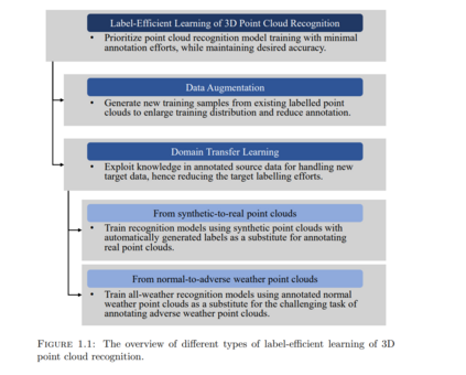 能够识别三维(3D)世界深刻影响了我们对物理环境的理解、可视化、交互和再创造。因其精确表示3D几何结构的特点,点云数据在学术界和工业界获得了显著关注。同时,深度神经网络(DNNs)已经在包括计算机视觉和自然语言处理在内的多个领域引发了革命。将点云与DNNs结合,催生了强大的深度点云模型,使得对3D世界的识别和理解得到了增强。然而,目前的DNNs点云识别模型严重依赖于大量密集标注的训练数据,这种数据的获取既费时又昂贵。这一限制阻碍了现有点云数据集的可扩展性,并妨碍了在不同任务和应用中的高效探索。本论文探讨了点云识别的标签高效学习,旨在在深度网络训练期间最小化标注工作,同时在点云识别中实现有效结果。研究聚焦于三个关键的标签高效学习类别:数据增强、从合成数据到真实数据的领域迁移学习,以及从正常到恶劣天气条件的领域迁移学习。通过这些代表性方法,我们旨在提高点云识别方法的效率和有效性。在标签高效学习范式中,数据增强在扩展有限标注训练数据的多样性方面扮演着至关重要的角色,需要更少的标注点云来训练准确的识别模型。在本论文中,我们引入了一种新颖的激光雷达点云增强技术,该技术在极坐标系中生成新帧,促进了在各种3D感知任务和场景中的模型训练。从合成数据到真实数据的领域迁移学习利用了来自具有自动生成标签的合成点云的知识,以提高深度模型在识别真实世界点云的性能。通过使用无限的合成标注点云,可以减少或消除真实点云中的人工标注,从而大大减轻了标注工作。在本论文中,我们首先创建了一个大规模的合成激光雷达点云数据集,具有精确的点对点注释。基于这个数据集,我们提出了两种新颖的方法,包括风格转换和无监着域适应,以解决合成和真实激光雷达点云之间的领域差异,并促进合成到真实领域迁移学习。从正常到恶劣天气数据的领域迁移学习旨在使用在正常天气条件下捕获的点云训练出的强大识别模型,在多种恶劣天气条件下表现良好。这一目标源于在注释恶劣天气点云时面临的额外挑战,因为它们与正常天气数据相比,具有不同的几何数据特性。我们探索了从正常到恶劣天气点云的知识迁移,以减少恶劣天气点云的大量手工注释需求。为此,我们首先构建了一个大规模的恶劣天气点云数据集,并进行了点对点的标注。随后,我们提出了一种域泛化和聚合方法,这使得仅使用正常数据训练的模型能够有效应对各种恶劣天气条件。通过在多种点云识别基准上进行的广泛实验表明,我们提出的标签高效学习方法取得了卓越的性能。