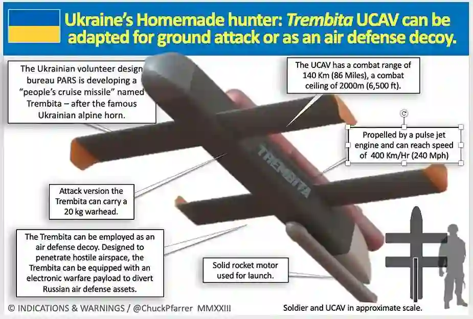"特雷比塔"(Trembita)是乌克兰设计和开发的一款经济型巡航导弹,其成本大大低于西方同类产品。该导弹以乌克兰西部喀尔巴阡山高原牧羊人使用的一种传统的高山长角命名,是由八名乌克兰工程师组成的专业团队的杰作。2023 年 7 月,法国 24 频道通过视频报道揭开了新型导弹的神秘面纱。