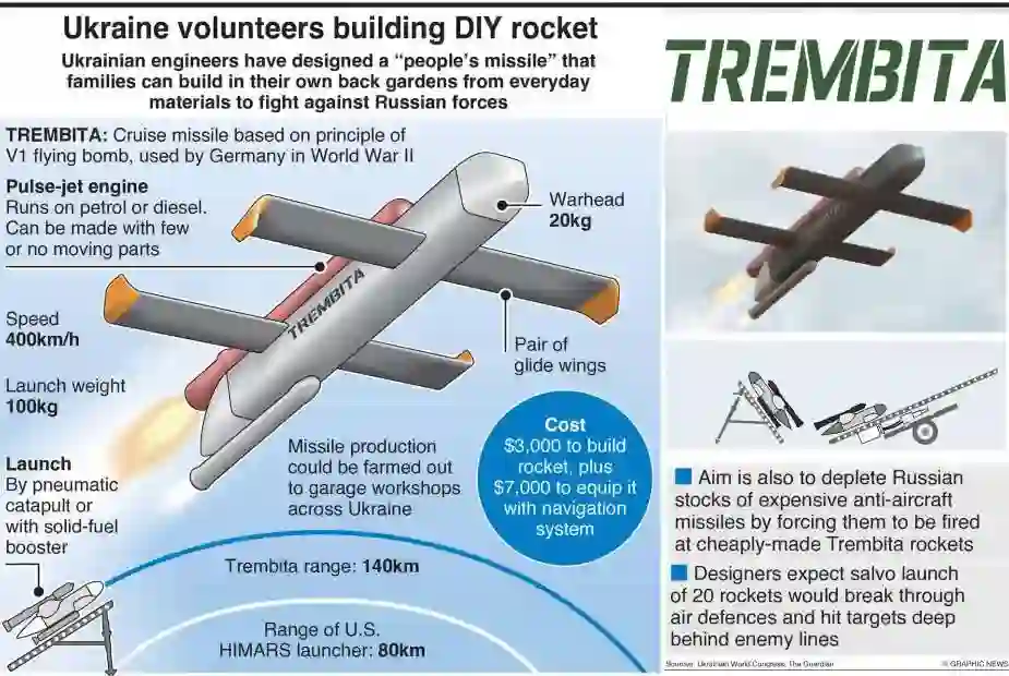 特雷比塔导弹的设计借鉴了二战期间德国使用的 V1 型飞行炸弹的原理。据负责研制该导弹的乌克兰工程师称,该导弹是一种新型武器,可使用气动弹射器或固体燃料助推器从战车或舰船上发射。