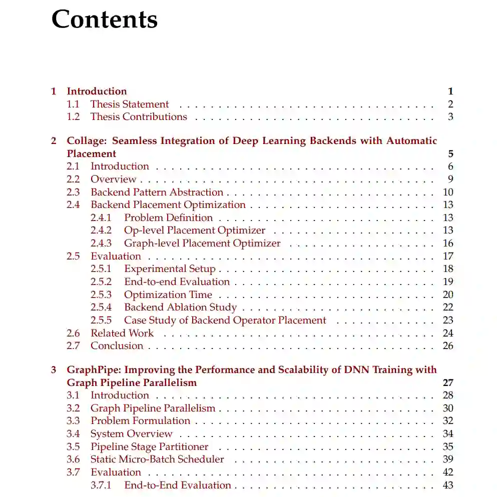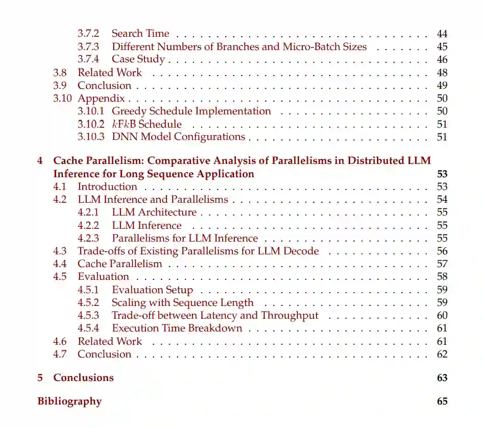 首先,我们构建了Collage,这是一种DL框架,提供了无缝集成DL后端的能力。Collage提供了一个富有表现力的后端注册接口,允许用户精确指定各种后端的能力。通过利用可用后端的规格,Collage自动搜索针对给定工作负载和执行环境的优化后端部署策略。 其次,我们开发了GraphPipe,一个支持高性能和可扩展DNN训练的分布式系统。GraphPipe自动将DNN划分为多个阶段的图,优化这些阶段的微批次调度,并实现DNN训练的并行化。这种方法推广了现有的顺序流水线并行性,并保留了DNN的固有拓扑结构,从而减少了内存需求并提高了GPU性能。 最后,我们对长序列应用中分布式LLM推理中的并行性进行了比较分析。具体来说,我们重点研究了Cache并行性(CP),这是一种在LLM推理的自回归解码步骤中并行化长KV缓存的方案。我们探讨了在需要处理数万个token的长上下文场景下,不同并行性之间的权衡。