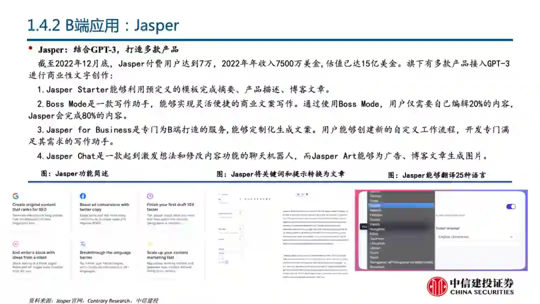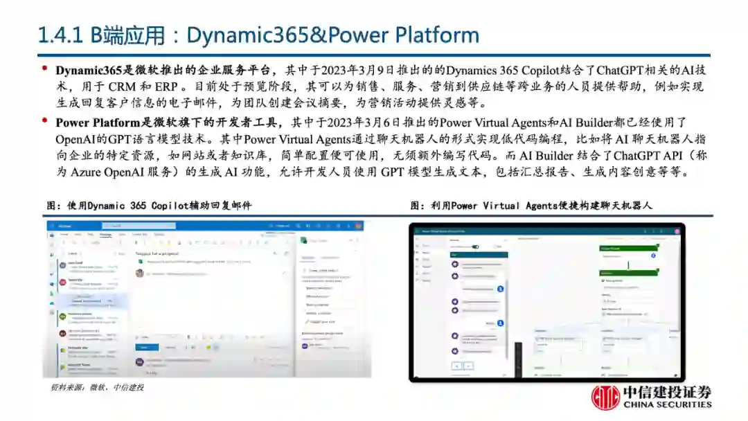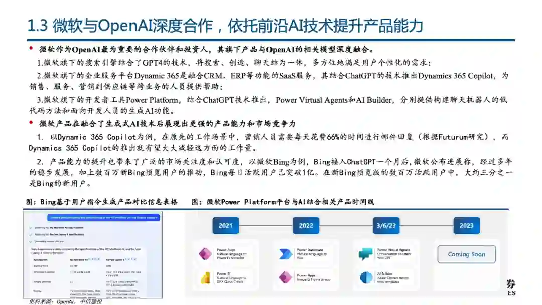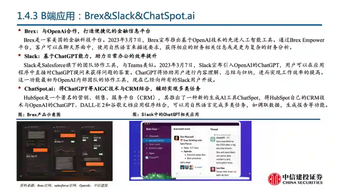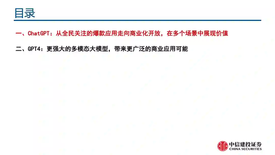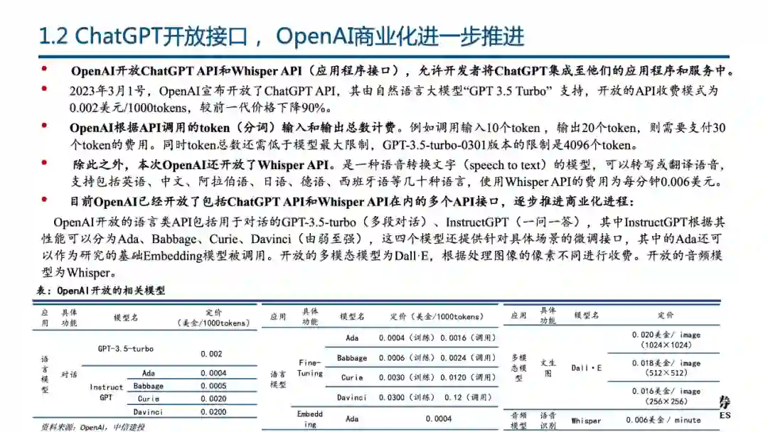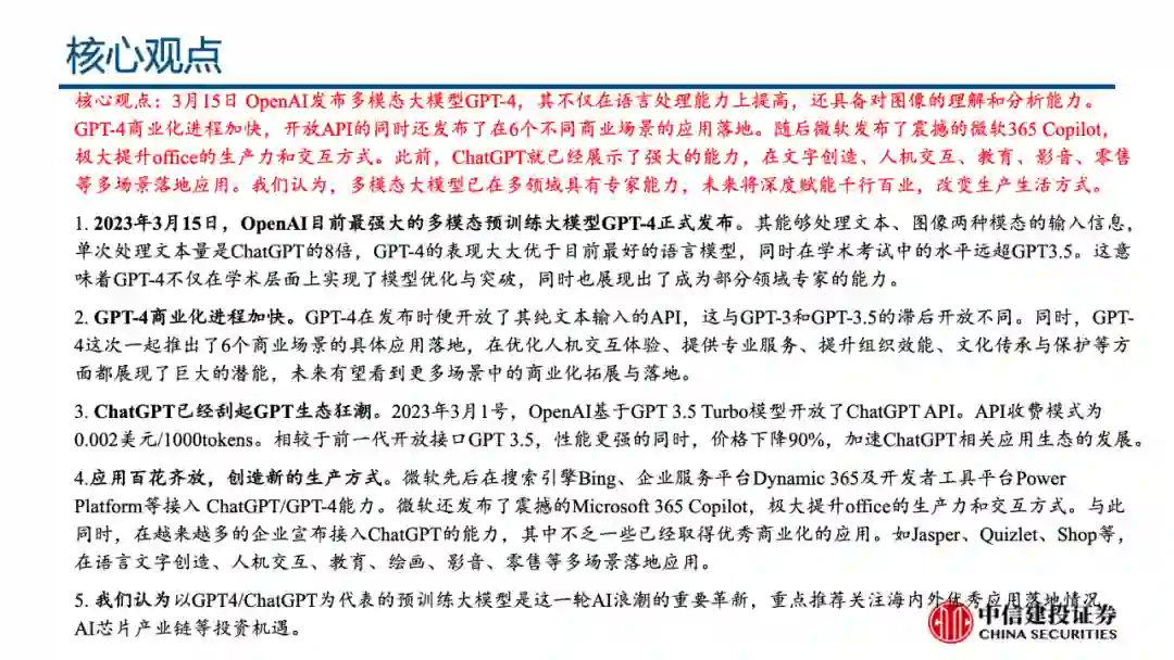 **2. GPT-4商业化进程加快。**GPT-4在发布时便开放了其纯文本输入的API,这与GPT-3和GPT-3.5的滞后开放不同。同时,GPT-4这次一起推出了6个商业场景的具体应用落地,在优化人机交互体验、提供专业服务、提升组织效能、文化传承与保护等方面都展现了巨大的潜能,未来有望看到更多场景中的商业化拓展与落地。 **3. ChatGPT已经刮起GPT生态狂潮。**2023年3月1号,OpenAI基于GPT 3.5 Turbo模型开放了ChatGPT API。API收费模式为0.002美元/1000tokens。相较于前一代开放接口GPT 3.5,性能更强的同时,价格下降90%,加速ChatGPT相关应用生态的发展。 **4.应用百花齐放,创造新的生产方式。**微软先后在搜索引擎Bing、企业服务平台Dynamic 365及开发者工具平台Power Platform等接入 ChatGPT/GPT-4能力。微软还发布了震撼的Microsoft 365 Copilot,极大提升office的生产力和交互方式。与此同时,在越来越多的企业宣布接入ChatGPT的能力,其中不乏一些已经取得优秀商业化的应用。如Jasper、Quizlet、Shop等,在语言文字创造、人机交互、教育、绘画、影音、零售等多场景落地应用。 5. 我们认为以GPT4/ChatGPT为代表的预训练大模型是这一轮AI浪潮的重要革新,重点推荐关注海内外优秀应用落地情况,AI芯片产业链等投资机遇。