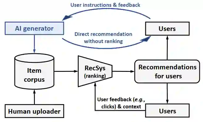 Overview:图4展示了提出的GeneRec范式的概述,其中包含两个循环。在传统的检索-用户系统循环中,人类,包括领域专家(例如音乐家)和普通用户(例如短视频用户),生成和上传items到items库。这些items根据用户偏好进行排名,其中偏好是从历史推荐的上下文(例如交互时间)和用户反馈中学习的。为了补充这种传统范式,GeneRec在AI generator和用户之间添加了另一个循环。用户可以通过用户指示和反馈来控制由AI generator生成内容,以满足个性化需求。