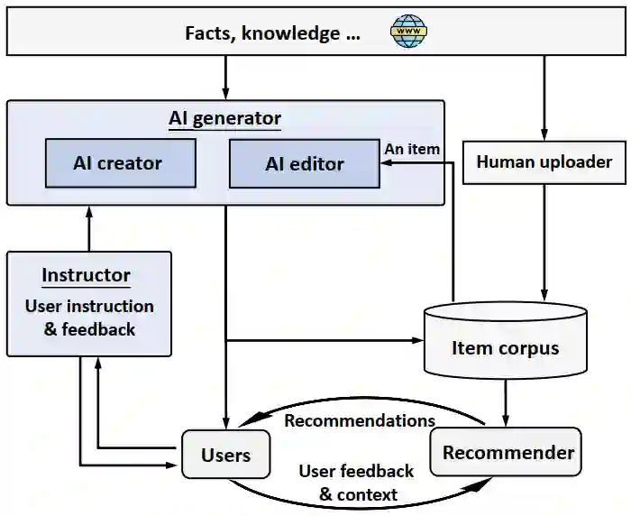 推荐系统通常从item库中检索items进行个性化推荐。然而,这种基于检索的推荐范式面临两个限制:1)人工生成的items可能无法满足用户多样化的信息需求,2)用户通常通过点击等被动且低效的反馈来调整推荐。如今,人工智能生成内容(AI-Generated Content, AIGC)已经在各个领域取得了显著的成功,其具有克服这些限制的潜力:1)生成式人工智能可以生成个性化items,以满足用户特定的信息需求,2)新兴的ChatGPT等大语言模型给用户提供了另一种通过自然语言指令以更准确地表达信息需求的可能。 在这种情况下,AIGC的兴起启发了下一代推荐范式的两个新目标:1)通过Generative AI生成个性化内容服务用户的多样化需求,2)收集用户的自然语言指令,以指导content generation。为此,我们提出了一种名为GeneRec的新型生成式推荐范式 (Generative Recommender paradigm), 其采用AI generator来进行个性化content generation,并利用用户指令获取用户的信息需求。具体而言,我们通过instructor对用户的指令和传统反馈(例如点击)进行预处理,并输出generation guidance。基于generation guidance,我们通过AI editor和AI creator实例化AI generator,分别用于编辑现有items和生成新的items。最终,GeneRec可以融合内容检索、编辑和生成功能,以满足用户的信息需求。此外,为确保生成的items的可信度,我们强调各种fidelity checks的重要性,例如真实性和合法性检查。最后,我们研究了在短视频的生成推荐中实现AI editor和AI creator的可行性,并展现了不错的结果。