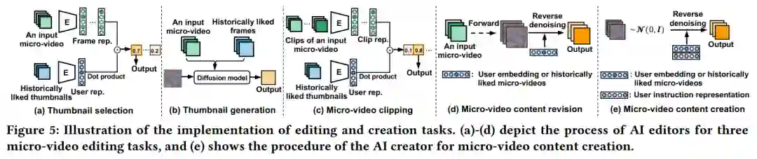 为了研究实例化GeneRec的可行性,我们采用AIGC方法在短视频数据集上实现AI editor和AI creator,图6提供了不同的实现方法。