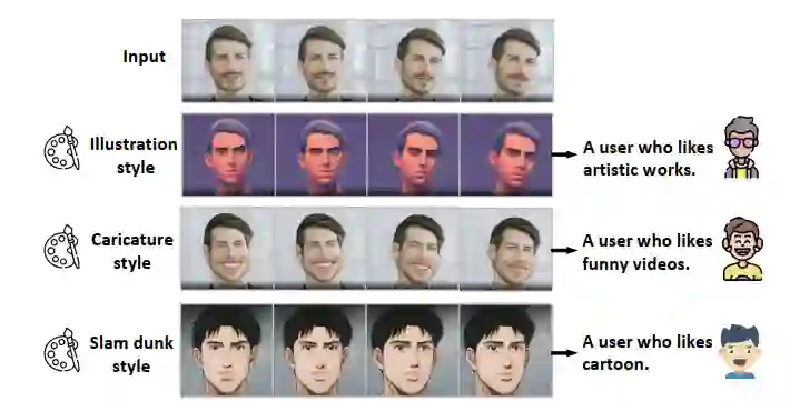 图3. 根据用户的个性化偏好,通过VToonify进行短视频转换的例子为此,我们提出了一种名为GeneRec的生成式推荐范式 (Generative Recommender paradigm),将强大的生成式人工智能集成到个性化content generation中,包括item的编辑和生成。图2说明了GeneRec如何在AI generator和用户之间新增一个反馈循环,将用户指令和反馈作为输入,AI generator需要理解用户的信息需求并生成个性化内容。然后,生成的内容可以添加到item库中进行排名,也可以直接推荐给用户。其中,用户指令不仅限于文本对话,还可以包括多模态对话,即将图像、视频、音频和自然语言融合起来表达信息需求。 为了实现GeneRec Paradigm,我们设计了一个模块来处理用户指令以及两个模块来实现AI generator。具体而言,instructor模块预处理用户指令和反馈以确定是否启动AI generator以更好地满足用户需求,并将指令和反馈进行编码以指导content generation。在给出指导后,AI editor重新利用现有items以满足用户的特定偏好,即个性化items编辑,而AI creator直接为用户生成新的个性化items。 为确保生成的items的可信度和高质量,我们强调从偏见、隐私、安全、真实性和合法性等方面进行各种fidelity checks的重要性。最后,为探索其范式的可行性,我们设计了几个短视频生成任务,并在一个高质量短视频数据集上进行了实验。实证结果表明,现有的AIGC方法可以完成一些编辑和生成任务,并且有望在未来实现GeneRec的目标。