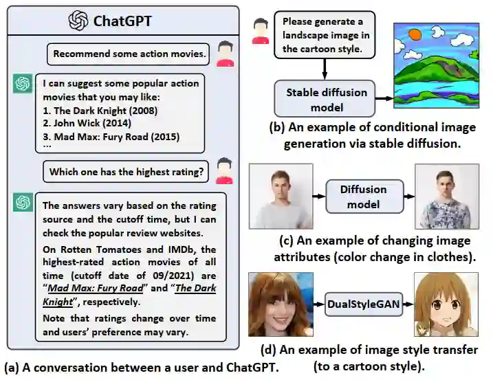 推荐系统往往检索items来满足用户的个性化信息需求。传统的推荐系统主要检索专家生成的item(例如电影)或用户生成的item(例如短视频)。然而,AIGC已经成为各个领域中的展现了强大的能力,如图1所示,ChatGPT展示出强大的自然语言对话能力,扩散模型(diffusion models)可以生成生动的图像并修改图像的指定内容,DualStyleGAN可以根据用户的要求轻松地转换图像风格。在AIGC的兴起推动下,推荐系统不应再受限于人工生成的内容,我们需要为推荐系统构想一种生成式推荐范式,自动地编辑现有items或生成新items来满足用户多样化的信息需求。