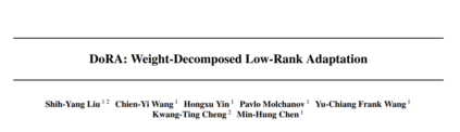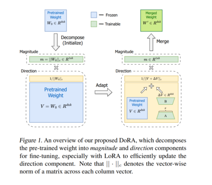 在广泛使用的参数高效微调(PEFT)方法中,LoRA及其变体因避免额外的推理成本而获得了相当的流行。然而,这些方法与完全微调(FT)之间通常仍存在准确性差距。在这项工作中,我们首先引入一种新颖的权重分解分析,以研究FT和LoRA之间的固有差异。为了模仿FT的学习能力,我们提出了权重分解的低秩适应(DoRA)。DoRA将预训练的权重分解为两个组成部分,幅度和方向,专门用于微调,并具体采用LoRA进行方向更新,以有效地最小化可训练参数的数量。通过使用DoRA,我们提高了LoRA的学习能力和训练稳定性,同时避免了任何额外的推理开销。在各种下游任务上,如常识推理、视觉指令调整和图像/视频-文本理解,DoRA始终优于LoRA,在对LLaMA、LLaVA和VL-BART进行微调时表现更佳。代码可在https://github.com/NVlabs/DoRA 获取。