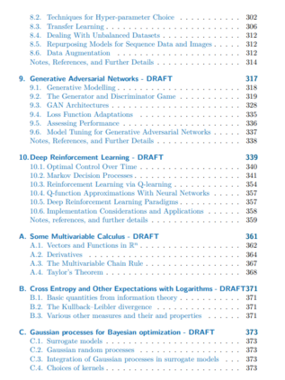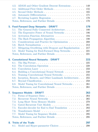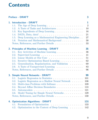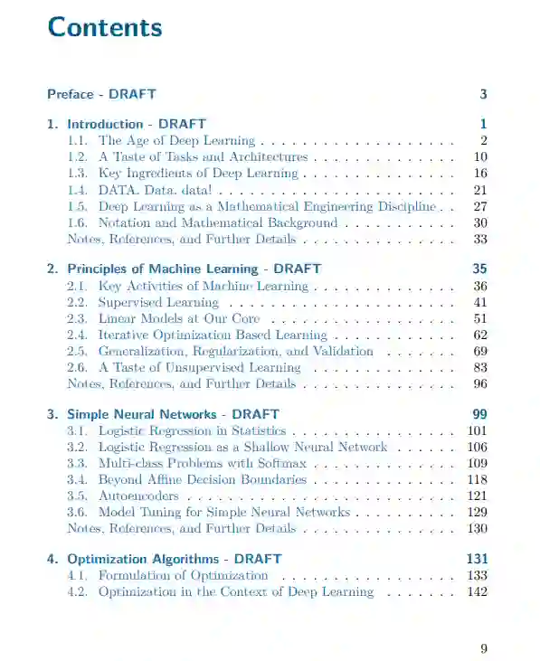 本书有10章和3个附录。第1-4章概述了机器学习的关键概念,概述了深度学习所需的优化概念,并重点介绍了基本模型和概念。第5-8章讨论了深度学习的核心模型和架构,包括全连接网络、卷积网络、循环网络,并概述了模型调整和应用的各个方面。第9-10章涉及特定领域,即生成对抗网络和深度强化学习。附录A-C提供了数学支持。以下是内容的详细概述。