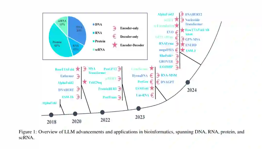 大型语言模型(LLMs)正在彻底改变生物信息学领域,为 DNA、RNA、蛋白质和单细胞数据的高级分析提供了强大支持。本综述系统回顾了最新进展,重点关注基因组序列建模、RNA 结构预测、蛋白质功能推断和单细胞转录组学。同时,我们还讨论了数据稀缺性、计算复杂性和跨组学整合等关键挑战,并探索了未来方向,如多模态学习、混合人工智能模型和临床应用。通过提供全面的视角,本文强调了大型语言模型在推动生物信息学和精准医学创新方面的变革潜力。1 引言生物信息学是一个跨学科领域,结合了生物学、计算机科学和信息技术,用于分析和解释复杂的生物数据(Abdi 等,2024)。近年来,大型语言模型(LLMs)在自然语言处理(NLP)领域取得了显著进展,其应用涵盖了广泛的任务(Min 等,2023;Raiaan 等,2024)。然而,生物数据的性质及相关任务与文本数据存在显著差异,带来了独特的挑战。如何准确且精确地处理生物医学数据,以有效构建适合 LLMs 的特征和嵌入,是一个持续存在的挑战,需要创新的解决方案。在生物学领域,任务具有高度的多样性和特异性。这些任务包括 DNA 序列的功能预测与生成、RNA 结构与功能的预测、蛋白质结构的预测与设计,以及单细胞数据的分析(涵盖降维、聚类、细胞注释和发育轨迹分析等)。研究人员对利用 LLMs 推动生物信息学和计算生物学的发展越来越感兴趣,并取得了显著成果。如图 1 所示,生物信息学中大型模型的开发、训练和应用正在快速增长。尽管如此,针对这些多样化任务的不同方法尚未得到系统总结和分析,这为全面回顾和综合提供了机会。本综述的组织结构:本文回顾了 LLMs 在生物信息学中的最新进展。我们首先介绍基本概念(§2),涵盖关键架构及其与生物数据的相关性。接下来,表 1 展示了生物信息学中具有代表性的 LLMs。随后,我们探讨了 LLMs 在 DNA 与基因组学(§3)、RNA(§4)、蛋白质(§5)和单细胞分析(§6)中的创新应用。最后,我们讨论了关键挑战(§7.1)并提出了未来方向(§7.2),强调多模态学习、混合人工智能模型和临床应用。总结部分,我们分析了本综述的局限性,指出了需要进一步探索的领域,以全面把握 LLMs 在生物信息学中的发展动态。