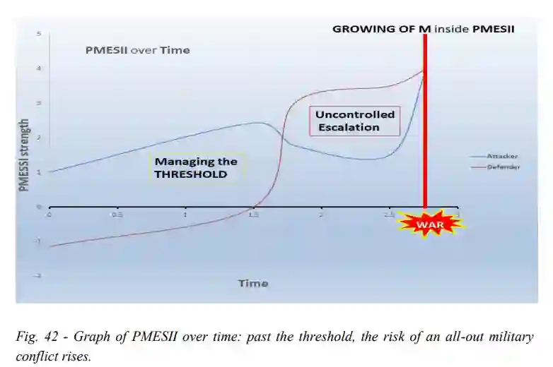 通过研究下图中提出的图表,Cayirci Bruzzone等人(2016)的模型中确定的阈值可能位于混合战争积累成混合冲突和混合冲突加剧成混合战争之间。然而,在Balaban & Mielniczek模型中,规避和故意无视战争法和人道主义法被认为是混合战争的某种 "化学 "副产品,而不是其支柱之一,或需要满足的先决条件;相反,Cayirci、Bruzzone等人(2016)的混合战争模型中对国际法的规避,对于否认责任是有帮助的,因此对于将冲突控制在阈值以下是必要的。