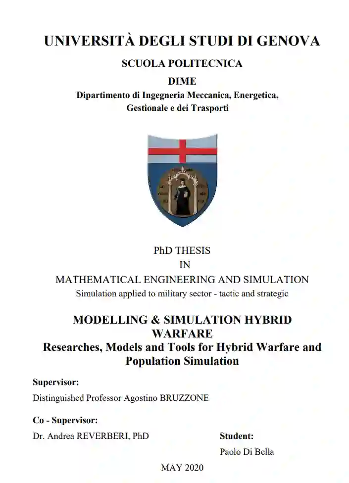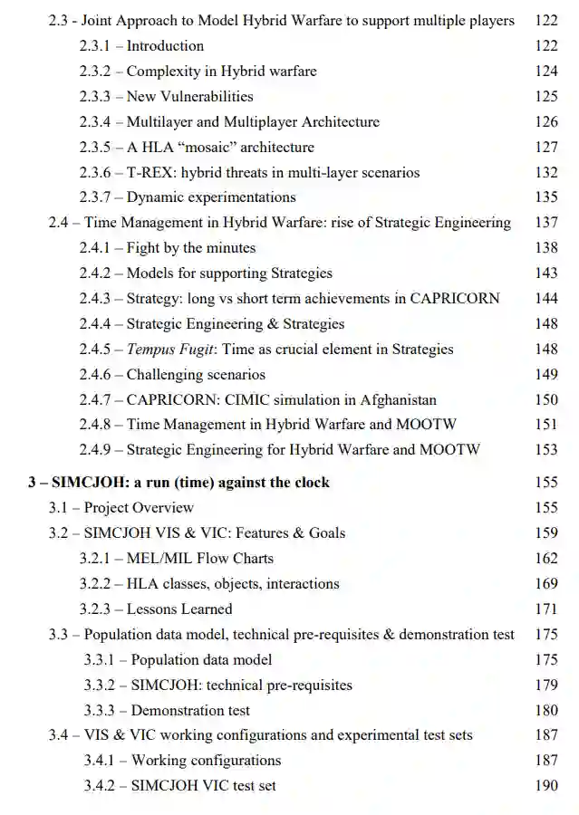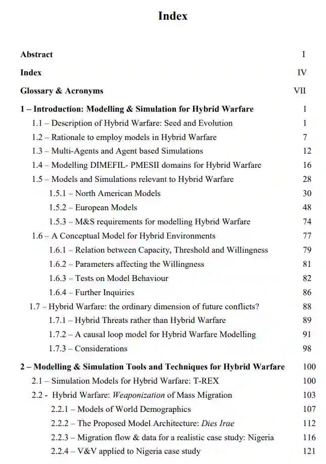 本论文的结构如下。第一章描述了根据建模与仿真(M&S)的既定基础和ET43的工作,为理解和正确处理混合威胁所带来的问题而开发的理论框架。第二章,利用M&S工具和技术,在混合冲突/非战争军事行动(CAPRICORN模拟器)的较量中,探讨了具体的混合场景,以及外生的大规模移民现象对欧洲大门造成的挑战(通过一个名为 "Dies Irae "的拟议模拟架构的视角进行审查),以及恐怖袭击与真相污损运动(T-REX模拟器)的结合。然后,在第三章中,在M2SG技术,特别是SIMCJOH模拟器的支持下,时间问题将在战术形势的框架内得到解决,但由于时间和人为因素的管理不当,有可能升级为严重的战略失误。SIMCJOH情景的重复结果将被展示出来,并提供深刻的见解。