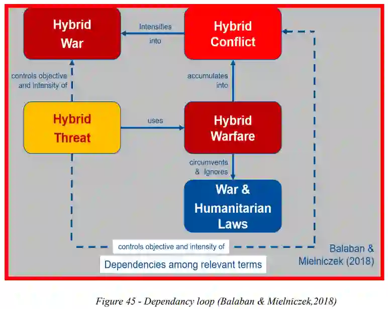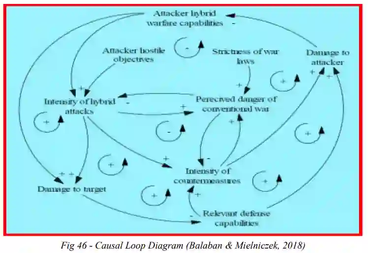 Balaban & Mielniczek提出的概念模型它是基于混合冲突的理论因果循环图,如图45和46所描述的。在这个循环中,混合攻击的强度由攻击者的敌对目标控制,在这些目标下,随着攻击者混合战争能力的扩大而增加。混合攻击强度的增加导致了对目标的更高损害,然而增加了反措施的强度。战争法的严格性(然而这并没有被输入到图中)定义了混合冲突和混合战争之间的界限,它对常规战争的感知危险有积极影响。常规战争的感知危险随着混合攻击强度的增加和反措施强度的增加而增加,但也会产生反馈联系,减少其因果因素。对目标的损害对其相关的防御能力有负面的影响,这与反措施的强度有正相关。反措施强度和相关防御能力都与攻击者的损害有正相关关系。