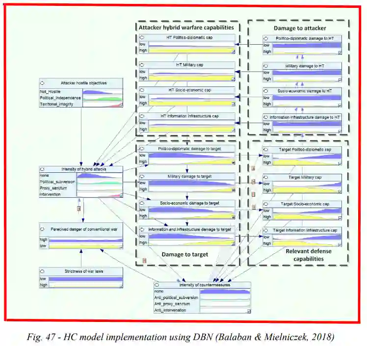 Balaban & Mileniczek(2018)提出的混合冲突模型的优点是通过因果循环图非常全面地描述了混合威胁的积累和随之而来转变为混合战争,然后是战争。它很好地描述了一个混合冲突的理论模型,采用了动态贝叶斯网络来证明其应用。更有争议的是对混合冲突中什么是合法的,什么是不合法的猜测,这是因为这个概念固有的政治和高度分裂的含义。在任何情况下,由于混合战争的主要目标之一(对于侵略者)是避免直接的军事冲突,Caiyrci, Bruzzone等人(2016)提出的门槛模型对于理解混合战争及其不可预见的升级为全面的武装冲突仍然至关重要。此外,在Balaban & Mielzniczek提出的模型中,"法律的严格性"--它标志着混合冲突和混合战争之间的界限--如果与上述阈值模型的动态性和灵活性相匹配,则显得相当静态,由于这个原因,它能够捕捉到混合战争和所谓的 "常规战争 "之间消失的、模糊的界限。在这两种情况下,Cayirci Bruzzone等人(2016年)和Balaban & Mileniczek(2018年)提出的DIMEFIL/PMESII_PT领域内的混合战争建模是一种勇敢的尝试,将社会、政治(以及在较小程度上的经济学--Hartley,2015年)等特别不被理解的现象的领域,引入纯硬科学采用的数学和统计工具以及方法。然而,仅仅使用硬科学的工具和方法还不足以获得客观性,在这方面,混合战争力学的表述达到了它们的极限:这是由这样一个事实构成的,即它们使用的代表混合战争的方程式的输入,不是在科学实验中观察到的物理数据,而是对现实的观察,隐含或明确地假设了一个价值判断。 这种价值判断是主观的,不像数学和物理科学那样客观,如果学术研究者管理不善,就会带来偏见;这种偏见除了会带来对现实的不可接受的扭曲,从而使科学的研究失去作用外,还可能被用来强制执行一种叙事的主流,其中包含了科学边界之外的 "真相"。然而,作者认为,通过严格的验证和确认过程(V&V),M&S科学家可以发现正在开发的模型中价值判断的影响。在这种观点下,第三章第7段解释了VV&A过程的重要性。