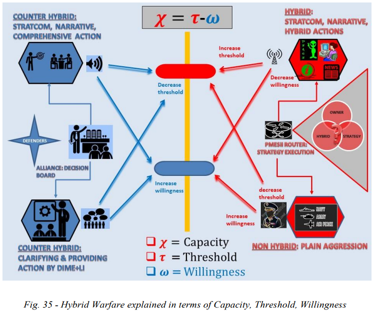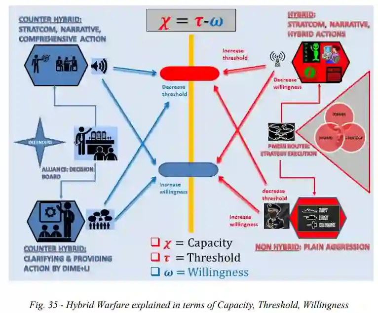 被告的目的完全相反,即降低门槛,增加意愿。其主要原因是,犯罪者的能力取决于门槛和意愿之间的差异。为此,被告需要澄清和证明现实是什么。应利用外交、信息、军事、经济、金融、执法和情报(DIMEFIL)领域的所有组成部分来实现这一目标。其目的是稳定受到混合攻击的联盟/国家,为消除混合威胁获得国际和合法支持。因此,综合方法和STRATCOM是被告的主要工具;对攻击者来说,主要工具是他的叙述,他可以在DIMEFIL上投射的力量,以及利用防御者的潜在弱点,如政治、民族和宗教分歧。在图31中,行动的结果被显示为 "增加或减少阈值/意愿"。然而,防守方还有一个很好的选择,那就是被动(即不采取行动);如果防守方被动,不采取全面行动,或者没有适当的STRATCOM叙述,意愿就会下降,阈值就会上升,所以有利于进攻方。