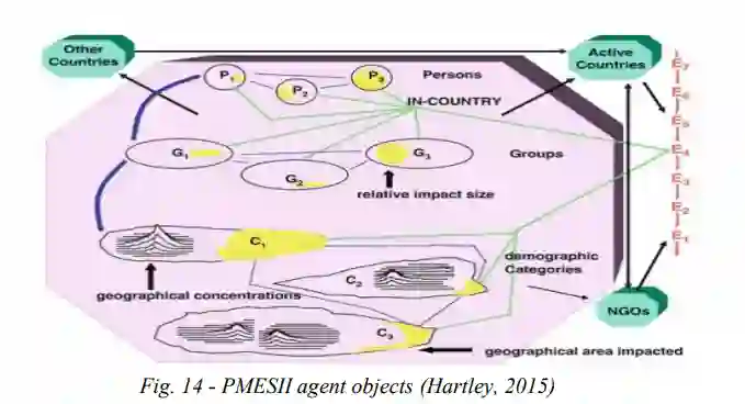 采用这种观点,很明显,现代(也包括过去)的军事行动和冲突不能用纯粹的动能效应术语来描述,如损害和杀伤(Hartley,2015)。甚至比起过去,目前的军事行动更需要有能力了解人类的地形和其中人类行为的各个层面(Levis & Elder, 2016)。莱昂哈德(1994)将军事行动重新组合为。和平(支持)行动(PO/PSO)、人道主义援助(HA)和救灾(DR)连同HADR、反叛乱(COIN)、反恐怖主义(CT)和战争以外的(军事)行动(MOOTW);后来的行动被称为稳定和支持行动(SASO),以及稳定、支持、过渡和重建行动(SSTR或SSTRO)。在这个框架中,对民众安全感的量化衡量、对本土政府的支持程度、国家的经济稳定以及其他非严格意义上的非军事变量都是衡量成功的重要指标。一些有形的非动能效应变量,如基础设施的重建状况、自由选举,都很重要。用来模拟这些行动的技术方法产生了DIMEFIL,它指的是一个国家影响PMESII状态的权力杠杆。单个PMESII状态的例子包括(美国国防部长办公室,2009):
