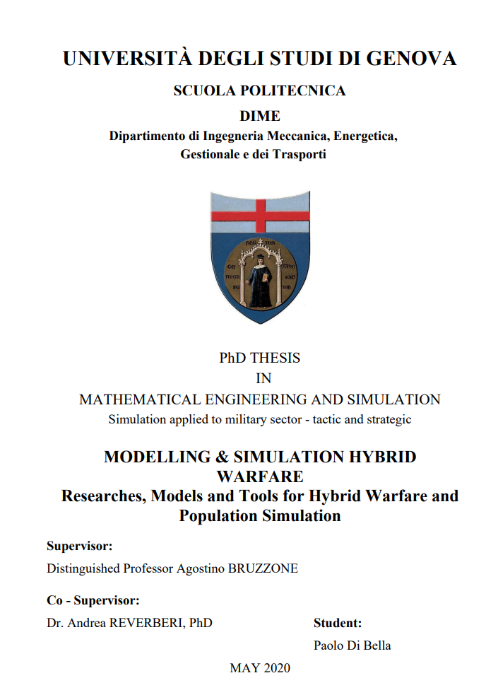 混合战争现象已经被Agostino Bruzzone教授(热那亚大学)和Erdal Cayirci教授(斯塔万格大学)的工作所框定,由于他们的工作,2016年6月北约探索小组n.43被北约建模与模拟小组(北约科学与技术组织的一个小组)批准,并在Armando Geller博士和Paolo Di Bella中校的参与下成立。在ET43中,作者通过介绍 "分秒必争 "讲座中的见解做出了个人贡献。美国陆军中校(Rtd.)罗伯特-莱昂哈德(Robert Leonhard)所写的 "按分钟作战:时间与战争艺术(1994年)"的演讲中提出了自己的见解。在这篇著作中,莱昂哈德广泛地提出了这样一个概念:"时间",而不是战场上火力,是军事行动中需要解决的关键因素,并延伸到混合战争领域中。在混合对抗中,对时间的批判性思考--包括其数量和质量方面--在SIMCJOH中得到了解决和研究,这是一个围绕挑战而建立的软件,从字面上看,它要求 "按分钟作战",与同名作品中表达的概念相呼应。