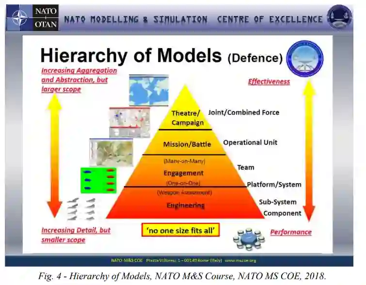 一般来说,更多的抽象性会导致更少的保真度,而分辨率和保真度是相互排斥的,所以你可以有更大程度的一个,而不是另一个;这取决于你要完成什么。下图显示了在军事领域,模型的层次结构与抽象性、保真度和分辨率的关系。