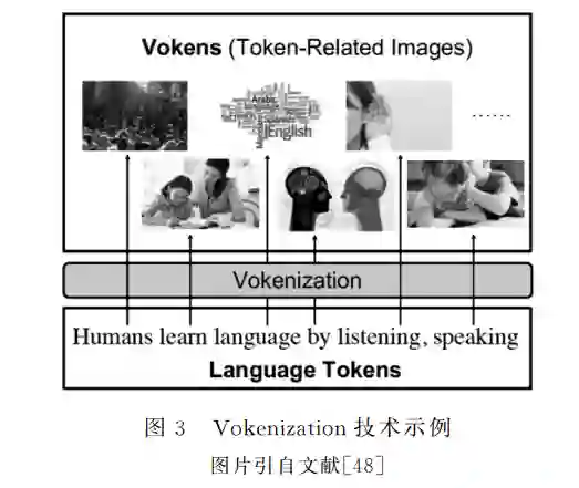 多模态对齐研究多个模态不同颗粒度元素间的 对齐关系,具体又分为显式对齐和隐式对齐。视觉语言跨模态的显式对齐任务研究图像和句子[46-47]、 图像和词[48]、图像中的目标和句子中的短语[49-50]间 的对齐关系。多模态对齐方法可直接应用于多模态 检索等应用,也可作为图像描述、VQA、多模态预训 练的训练语料,尤其是在缺乏大规模多模态人工标 注语料的场景。 图像和句子(或文档内其他文本单元)间的显式 对齐通常是不存在的。对此,Hessel等人[46]提出了 一种将同一网页内的图像和句子对齐的无监督方 法。该方法在7个难度不同的数据集上获得了不错 的性能。Suhr等 人[47]定 义 了 一 个 视 觉 推 理 任 务 NLVR2,对于给定的两幅图像和一段自然语言的描 述,要求模型判断它们是否存在语义上的对齐关系。 文本预训练语言模型已经取得了巨大的成功, 但该方法仅使用文本上下文信息作为监督信号,导 致词的 上 下 文 表 示 学 习 严 重 依 赖 词 的 共 现 关 系 (Co-occurrence),缺乏外部物 理 世 界 的 背 景 知 识。 为了给预训练语言模型提供视觉监督信号,Tan等 人[48]提出了 Vokenization技术(图3),其通过给文 本中的每一个词打上一幅图像的标签,实现在大规 模文本语料上自动构建多模态对齐语料库。在大规模图像-词汇对齐的多模态语料库上训练的预训练 语言模型可增强其对自然语言的理解能力。实验证 明,该 模 型 在 多 个 纯 文 本 的 任 务 上 (如 GLUE、 SQuAD和SWAG 等)均获得了显著的性能提高。