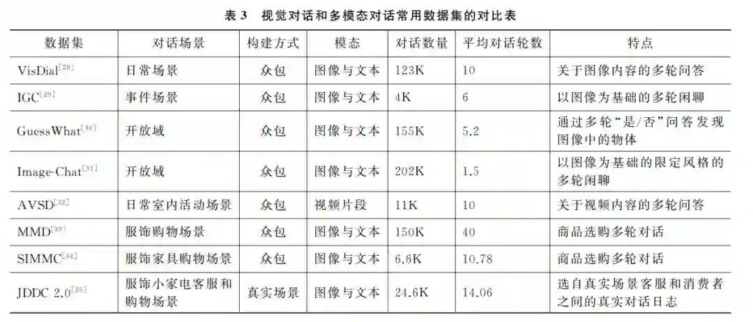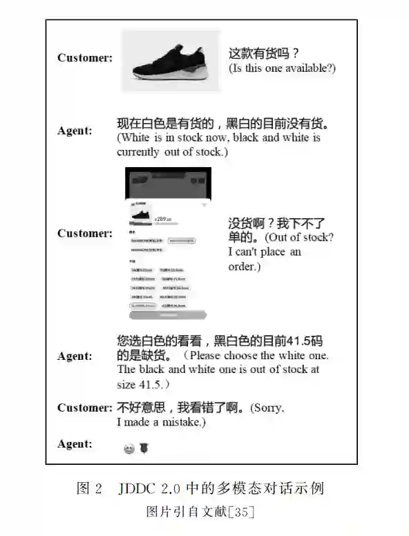 多模态对话(MultimodalDialog)关注更接近人 类自然对话的多模态人机对话技术的研究。它与上 一节介绍的视觉对话的主要差异有:①多模态对话 给定的输入图像可能是多幅的;② 随着对话的推 进,图像是不断更新的;③用户问题和模型的回答 可以是文本的、图像的或者图文结合的;④模型可 能需要查询外部领域知识库才能回答用户的问题 (如购物者希望看到更多与特定商品相似的商品,或 者要求提供满足某些特征的商品,或者查询特定商 品的属性等);⑤模型可能需要通过反问等对话策 略澄清用户需求。零售和旅游等限定领域的多模态 对话最近受到了越来越多的关注。常用的面向购物场景的多模态对话数据集有 MMD [33]、SIMMC [34]和JDDC [35]。MMD 是在服饰 专家的指导下通过模拟扮演(Wizard-of-Oz,WoZ)的 方式收集的时尚购物场景的数据集。SIMMC2.0是 时尚和家 具 购 物 场 景 的 数 据 集。其 中,时 尚 和 家 具杂乱的购物场景是通过逼真的 VR 场景生成器 (VRSceneGenerator)生成的。与 MMD 和 SIMMC 不同,JDDC2.0是从电商平台客服和消费者之间的 真实对话数据中采样的(图2)。JDDC2.0包括多模 态对话24.6万,其中,图片50.7万张,平均对话 轮 数14轮。此 外,JDDC2.0还 提 供 了30205个商品的759种商品属性关系,共计21.9万的<商品ID、 属性、属性值>三元组。 视觉对话和多模态对话常用数据集的详细对比 如表3所示。