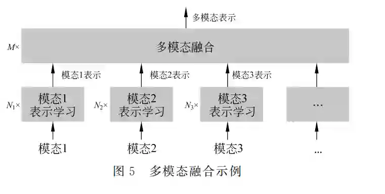 多模态融合将多个单模态表征整合成为一个多 模态信息表征,它是多模态信息处理的核心问题。多 模态融合的示例如图5所示,其中,Ni{i=1,…K} 表示单模态表示学习模型的模型深度,M 表示K 个多模态表示的融合模型深度。多模态融合的研究方 向有:基于多模态互补性的全模态融合问题、模态 模糊或者模态缺失下的鲁棒性融合问题、非对齐的 多模态融合问题等。目前,大部分工作是关于模态 对齐且无模态缺失情况下的多模态融合算法研究, 这也是多模态融合中最基础的挑战。本节根据单模 态的特征表示、多模态融合的阶段、多模态融合的模 型结构等对多模态融合方法进行分类介绍。