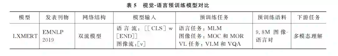 表 5 中 的 表 示 “图像,语言”对,I表示一幅图像,w=w1,…,wT 表 示长度为T 的文本表示。g=g1,…,gG 是图像区 域表示,q=q1,…,qK 和v=v1,…,vK 分别表示图 像中的目标的文本表示和目标的视觉表示。g 和 v的提 取 可 参 考 2.1 节 的 介 绍。 此 外,[SEP]、 [IMG]、[CLS]等 特 殊 标 记 用 来 分 割 不 同 模 态。 MLM(MaskedLanguage Model)是根据未掩码的 词 和 图 像 区 域 预 测 掩 码 单 词。 MOC(Masked ObjectClassification)根据未掩码的图像区域和文 本预 测 掩 码 区 域 的 目 标 类 别。 MOR (Masked ObjectRegression)根据未掩码的图像区域和文本 预 测 掩 码 区 域 的 特 征 表 示。 MSG (Masked SentenceGeneration)根据输入图像逐字生成句子。 VQA 根据输入的图像和该图像相关问题预测该问 题的答案。CMCL 是跨模态对比学习任务。VLM 是预测图像-文本对是否语义一致。