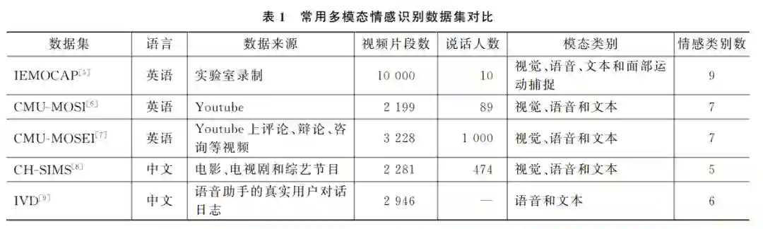 情感是人类区别于机器的一个重要维度,而人 的情感往往又是通过语音、语言、手势、动作表情等 多个模态表达的。在交互场景下,多模态情感识别 研究如何从人的表情和动作手势、语音音调、语言等 多模态信息中理解用户细颗粒度的情感表达,进而 指导人机交互策略。其主要研究内容有:①基于 多模态信息互补性和异步性的动态融合;②高噪 声环境下对于模态模糊或模态缺失问题的鲁棒性 融合;③客服和营销等自然交互情境下的情感识 别等。 多模态情感识别的常用数据集有IEMOCAP [5]、 CMU-MOSI [6]、CMU-MOSEI [7]、CH-SIMS [8] 和 IVD [9]等。 数 据 集 的 多 维 度 比 较 如 表 1 所 示。 IEMOCAP数据集收录了10位演员的表演数据,包 含视频、语音、面部运动捕捉和文本模态,并标注了 高兴、悲 伤、恐 惧 和 惊 讶 等 共 9 类 情 感。CMUMOSI数据集收录了89位讲述者的2199条视频 片段,每段视频标注了7类情感。CMU-MOSEI数 据集是 CMU-MOSI的扩展版,收录了 1000 多名 YouTube主播的 3228 条视频,包括 23453 个句 子,每个句子标注了7分类的情感浓度(高度负面、 负面、弱负面、中性、弱正面、正面、高度正面)和6分 类的情 绪 (高 兴、悲 伤、生 气、恐 惧、厌 恶、惊 讶)。 CH-SIMS数据集是一个中文多模态情感分析数据 集,该数据集为2281个视频片段标注了细颗粒度的情感标签。IVD 是从中文语音助手的真实用户 对话日志中抽取的语音情感数据集,包括500000 条无标注的语音数据和2946条带6分类情感标注 的语音数据。