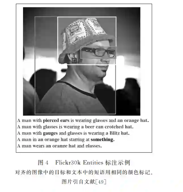 图像中的目标和文本中的短语对齐也被称为图 像短语定位(PhraseGrounding),可用于提高图像 描述、VQA、视 觉 导 航 等 视 觉-语 言 下 游 任 务 的 性 能。Plummer等人[49]发布了一个大规模的短语定 位数 据 集 Flickr30kEntities,如 图 4 所 示。Wang 等人[50]提出了一种基于细粒度视觉和文本表示的 多模态对齐框架,在 Flickr30kEntities数据集上显 著提高了短语定位的性能。