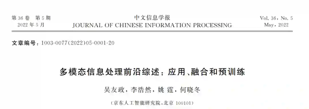 近些年,研究者从不同的视角对多模态信息处 理技术做了很好的总结回顾。Zhang等人[2]围绕图 像描述、视觉-语言生成、视觉问答和视觉推理四个 应用,从计算机视觉的角度总结了多模态表示学习 和多模态融合的最新进展。Summaira等人[3]的综 述覆盖了更多的多模态应用,并根据应用组织了每 一个多模态应用的技术进展和局限性。