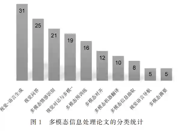 我们分析了最近两年在自然语言处理领域国际 学术会议上(ACL、EMNLP、NAACL)发表的多模 态信息处理的论文,并从应用的角度对论文进行了 分类。关注度较高的多模态应用如图1所示。本节将对这些应用展开介绍。除此之外,多模态应用还 包括视听语音识别(Audio-VisualSpeechRecognition)、多 模 态 语 言 分 析 (Multimodal Language Analysis)和视觉辅助的句法分析[4]等。文献[4]还 获得 NAACL2021的最佳长文奖。