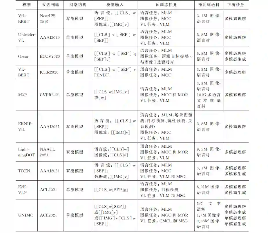 从表5中的11个图像-语言跨模态预训练模型 的对比,我们发现的跨模态预训练模型的特点如下: ①单流模型和双流模型均被广泛采用。虽然双流模 型可以适应每种模态的不同处理需求,但目前尚无 完整的实验证明双流模型优于单流模型。②多模态 预训练模型从应用于多模态理解任务或多模态生成 任务发展到可兼顾多模态理解和生成两大任务的统 一模型。③相对动辄上百 G 甚至 T 级别的单模态 数据,多模态对齐数据的规模有限。最新的多模态 预训练模型可以利用互联网上的大规模非对齐的文 本数据、图像数据、以及文本-图像对齐数据学习更 通用的文本和视觉 表 示,以 提 高 模 型 在 视 觉 和 语 言的理解和生成能力,如 M3P和 UNIMO。④多 模态预训 练 模 型 从 仅 应 用 于 多 模 态 下 游 任 务 发 展到可同 时 应 用 于 单 模 态 下 游 任 务 和 多 模 态 下 游任务。 上述的多模态预训练模型需要在大量图像文本 的对齐语料上进行训练。然而,此类数据的收集成 本昂贵,很难扩大规模。受无监督机器翻译[123-124] 的启发,Li等人[125]提出了一种不依赖图像-文本对 齐语料的预训练 U-VisualBERT,该预训练模型的 输入是一批文本数据,或一批图像数据,并通过图像 中物体标签作为锚点(AnchorPoints)对齐两种模态。U-VisualBERT 在四个多模态任务上取得与使 用多模态对齐数据训练的预训练模型接近的性能。 该方向可能会是接下来的一个研究热点。