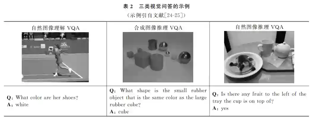 视觉问答(VisualQuestionAnswering,VQA)[22-27] 是2015年新提出的任务,简单来说就是图像问答。 给定一幅图像和一个关于该图像的开放式自然语言问题,要求模型准确回答该问题。视觉问答是一个典 型的多模态问题,需要模型具备物体定位、属性检测、 事件分类、场景理解和推理及数学计算等能力。根据 图 片 类 型 的 不 同,VQA 又 分 为 自 然 图 像 理 解 VQA [22-23]、合成图像推理 VQA [24]和自然图像推理 VQA [25]。表2列举了这3种 VQA的示例。 VQA常用数据集有 VQAv1/v2 [22-23]、CLEVR [24] 和 GQA [25]。VQAv1/v2是自然图像理解 VQA 数 据集,VQAv2 解 决 了 VQAv1 中 明 显 的 语 言 先 验 (LanguagePriors)问题。CLEVR [24]是合成图像推 理问答数据集。CLEVER 中的图像由简单的几何 形状的物体组成,旨在测试模型对组合式语言的理 解能力和对视觉场景的推理能力。CLEVR 数据集 中的图像是程序合成的,其场景的复杂度与自然场 景相去甚远。对此,Hudson等人[25]发布了基于自 然图像的组合式问题视觉问答数据集 GQA,该数据 集包括关于11.3万幅图像的超过2000万的问题。 每幅图像都标注了一个场景图(SceneGraph),表示 图像中的对象、属性和关系。每个问题都对应一个 功能性程序(FunctionalProgram),列出了获得 答 案所需执行的一系列推理步骤。每个答案都有与之 对应的验证信息,指向图片中的相关区域。