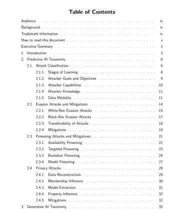 这份文档定义了一套攻击的分类体系,并在AML领域引入了术语。这个分类体系基于对AML文献的综述建立,按照概念层次排列,包括关键的ML方法类型和攻击的生命周期阶段、攻击者的目标和目的、以及攻击者对学习过程的能力和知识。报告还提供了相应的方法来减轻和管理攻击的后果,并指出了在人工智能系统的生命周期中需要考虑的相关开放性挑战。报告中使用的术语与AML文献保持一致,并由一个词汇表补充,该词汇表定义了与人工智能系统安全性相关的关键术语,旨在帮助非专家读者理解。综合来看,这个分类体系和术语旨在为评估和管理人工智能系统的安全性的其他标准和未来的实践指南提供信息,通过建立一个共同的语言和对迅速发展的AML领域的理解。与分类体系一样,术语和定义并非旨在全面,而是为了帮助理解在AML文献中出现的关键概念。
