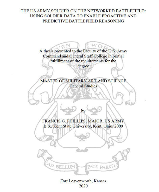 这项研究的目的是为步兵旅战斗队(IBCT)提出解决方案,以加快战场决策,并在多域战场上保持战术超配。本研究将确定如何通过收集基于士兵的数据,到 2030 年在地面战术层面实现主动和预测性战场推理(PPBR)。作者假设,美国陆军应通过融合人体可穿戴传感器和设备、机器学习软件以及美国陆军的各种举措来利用士兵数据,以便到 2030 年实现 PPBR。对美国陆军新兴概念和能力需求以及预计的未来作战环境(FOE)的分析为研究结果提供了依据。战术解决方案旨在最大限度地发挥人的潜能,并通过人机协同在单兵层面加速认知。虽然有证据表明美国陆军可以做到这一点,但对这一课题的坦率分析却引出了一个问题: 美国陆军是否应致力于全面主导信息空间,以加速战场决策,实现战术超配。多域作战中的美国陆军强调信息空间,其意义与主要机动域几乎相当。对工业和军事现代化趋势的定性元综合显示,信息曾是国家权力的一种独立工具,但在未来的网络化战场上,它将成为首选工具。基于士兵的数据是网络化信息空间的关键组成部分,指挥官应利用这些数据保持单元内部的行动自由。机动单元在数据驱动下做出明智决策的速度,将是在网络战场上实现战术超越的决定性因素。与利用士兵数据和其他数据类型实现 PPBR 的超自动化决策相比,卓越的直接火力武器系统可能很快就会黯然失色。对于战士技能 1 级任务来说,采用这一概念并非难事: 射击、移动、通信、维持、生存和信息。采用人机协作的方式来综合士兵信息,将使指挥官能够提高决策速度和态势感知能力,并积极主动地缓解战场态势。积极主动的预测性战场推理,其基础扎根于士兵内部数据的收集,将使美国陆军能够准确预测其作战范围。就像今天的汽车传感器会告知驾驶员诊断问题或剩余里程一样,士兵佩戴的联网传感器套件也将简化曾经需要宝贵时间和注意力的战场任务。世界上的大国竞争者有可能正在军事领域下一场革命的边缘徘徊:超自动化战场决策。美国陆军有可能在中期实现这场革命。