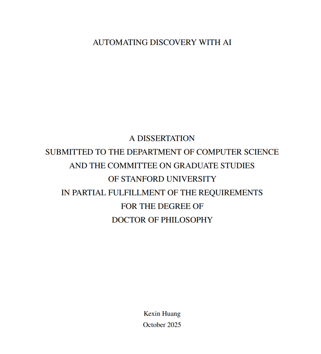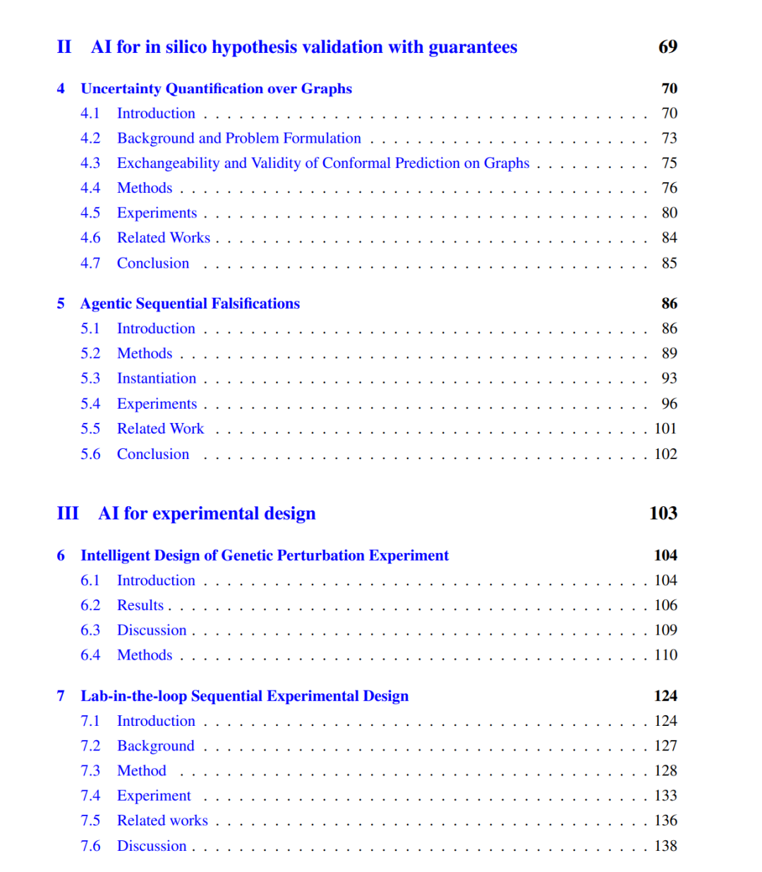 生成与验证新假设的过程需要整合多样的数据模态、在异构实验设计中进行探索,并反复执行耗时的重复性任务。本文探讨人工智能是否能够充当一名“虚拟AI生物学家”——一种能够在大规模上实现生物医学发现端到端自动化的系统。我将这一愿景称为 “发现自动化”(discovery automation)。 我将科学发现过程框定为由两个核心阶段构成的循环:(1)假设生成(hypothesis generation) 与(2)假设验证(hypothesis validation)。 在第一部分(Part I),我提出了面向知识驱动的假设生成的AI方法,其中包括 KGWAS ——一种将全基因组关联分析(GWAS)与大规模功能基因组学知识图谱相结合的方法,用以提升在样本量不足群体中的发现能力;以及 TxGNN ——一种用于大规模药物再利用(therapeutic repurposing)的多模态图神经网络。 在第二部分(Part II),我提出了用于计算机模拟(in silico)假设验证的严格统计框架,包括将保形预测(conformal prediction)扩展至图结构数据的 CF-GNN,以及一种用于基于有效e-value进行连续假设证伪(sequential hypothesis falsification)的智能体框架 Popper。 在第三部分(Part III),我设计了支持智能实验设计(intelligent experimental design)的AI系统,包括 GEARS ——一种推荐高价值基因扰动(genetic perturbations)的系统,以及 IterPert ——一种通过主动学习(active learning)实现闭环序列实验选择(closed-loop sequential experiment selection)的算法。 在第四部分(Part IV),我介绍了 Biomni ——首个通用型生物医学研究AI智能体,能够从文献挖掘、数据分析到实验规划与假设检验,协调整个科研工作流。 综上,这些工作为AI驱动的生物医学发现自动化奠定了方法与系统基础。研究结果表明,人工智能能够加速、扩展并系统化科学发现过程,使研究者能够将精力集中于创造性推理与结果解释,而将重复性、机械化与整合性任务交由智能体完成。