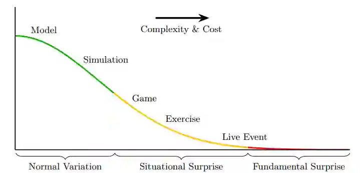 针对正常波动与突发意外的训练方法沿复杂度、成本与价值构成连续谱系。Alderson等人[1]将训练划分为五类:模型推演、模拟仿真、兵棋推演、实兵演习及实战化演训(其模型与仿真定义异于常规:此处指建模保真度差异)。图1展示训练类型与意外类型的对应关系。各类训练对即兴能力培养的适用性如下:当系统可脱离细节与语境仍具效用时,模型推演最为适用——其将复杂系统简化为可处理表征以探索标准态势。虽可通过随机要素应对部分情境型意外,但场景偏离标准操作条件时模型易出现误判。模拟仿真则利用系统细节探究复杂性(如车辆模型仅预设方向盘转向响应,仿真却可解析转向动作对整车部件的具体影响)。模拟仿真与模型推演对情境型意外存在类似局限,但仿真更易因系统交互复杂性产生意外状态。两者均无法应对根本型意外——因所有情境必须预先编程。
