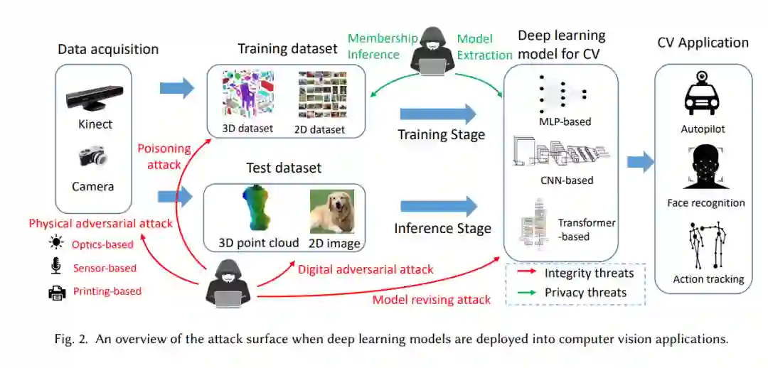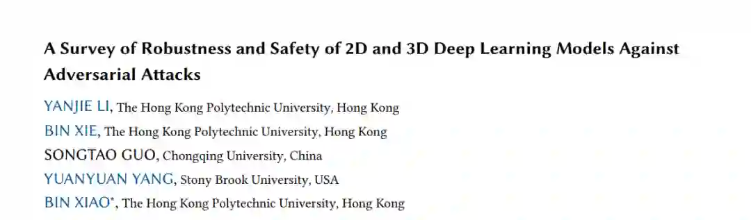 来自香港理工大学等最新《2D和3D深度学习模型对抗性攻击的鲁棒性和安全性》综述 凭借深度学习的迅速发展,2D和3D计算机视觉应用已在许多安全关键系统中部署,例如自动驾驶和身份验证。然而,由于它们对对抗性攻击的鲁棒性有限,深度学习模型还不够值得信赖。可实现的对抗性攻击进一步对应用和人身安全构成致命威胁。已经有很多论文探讨了深度学习模型对抗性攻击的鲁棒性和安全性。为了实现值得信赖的AI,我们首先从不同的角度构建一个通用的威胁模型,然后全面审查2D和3D对抗性攻击的最新进展。我们将对抗性示例的概念扩展到不可感知的干扰之外,并整理了超过170篇论文,以概述深度学习模型对各种对抗性攻击的鲁棒性。据我们所知,我们是首个系统研究3D模型对抗性攻击的,这是一个应用于许多实际应用的蓬勃发展的领域。此外,我们还研究了导致安全违规的物理对抗性攻击。最后,我们总结了目前的热门话题,提供了对挑战的见解,并为值得信赖的AI未来的研究提供了启示。